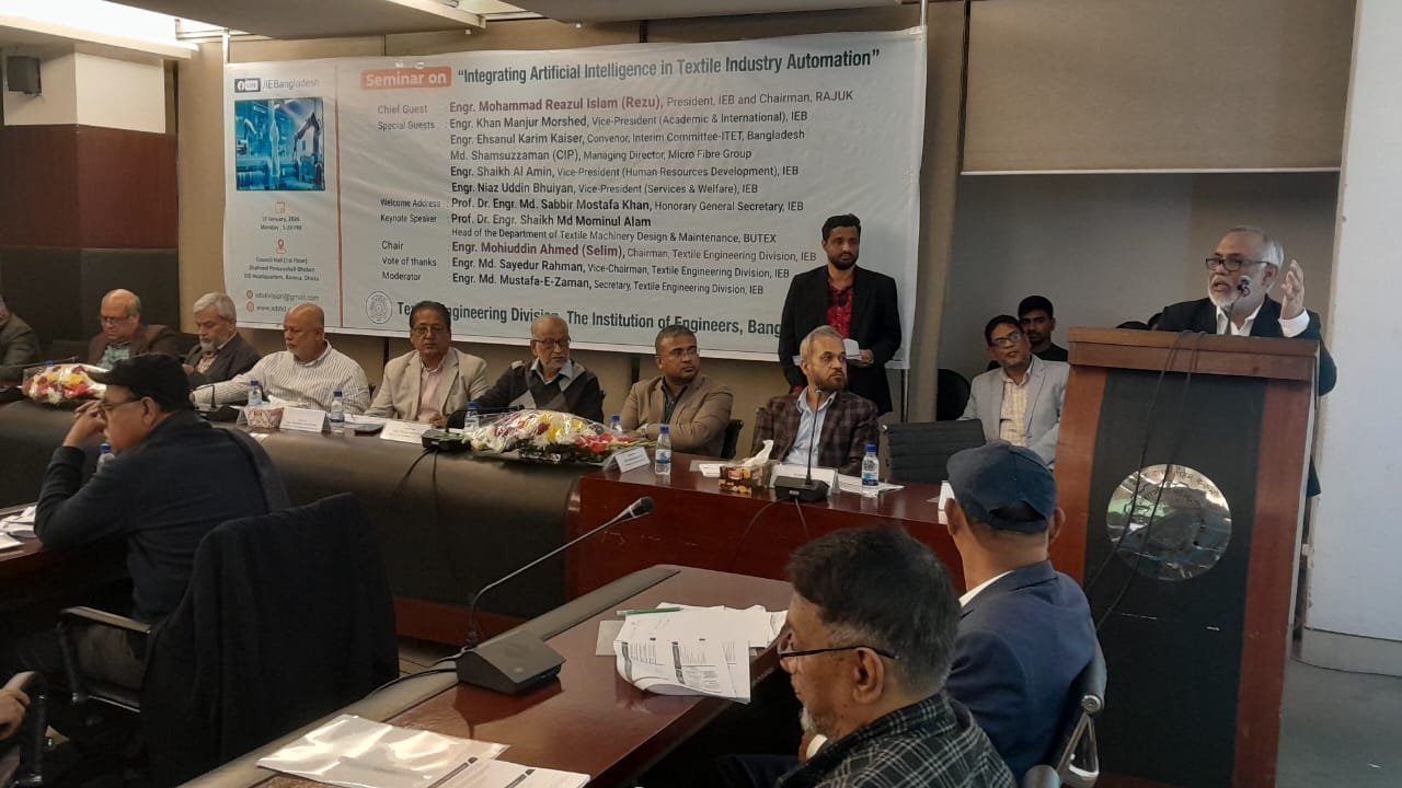 বাংলাদেশের টেক্সটাইল শিল্পে আধুনিক প্রযুক্তির সমন্বয় এবং অটোমেশনে কৃত্রিম বুদ্ধিমত্তার (এআই) ভূমিকা ও সম্ভাবনা নিয়ে দ্য ইনস্টিটিউশন অব ইঞ্জিনিয়ার্স বাংলাদেশ (আইইবি)-এর টেক্সটাইল ইঞ্জিনিয়ারিং বিভাগের উদ্যোগে সেমিনার অনুষ্ঠিত হয়েছে। সোমবার (১৯ জানুয়ারি) সন্ধ্যায় রাজধানীর রমনায় আইইবি সদর দপ্তরের শহীদ প্রকৌশলী ভবনের কাউন্সিল হলে “ইন্টেগ্রেটিং আর্টিফিশিয়াল ইন্টেলিজেন্স ইন টেক্সটাইল ইন্ডাস্ট্রি অটোমেশন” শিরোনামে এই সেমিনারটি আয়োজিত হয়।