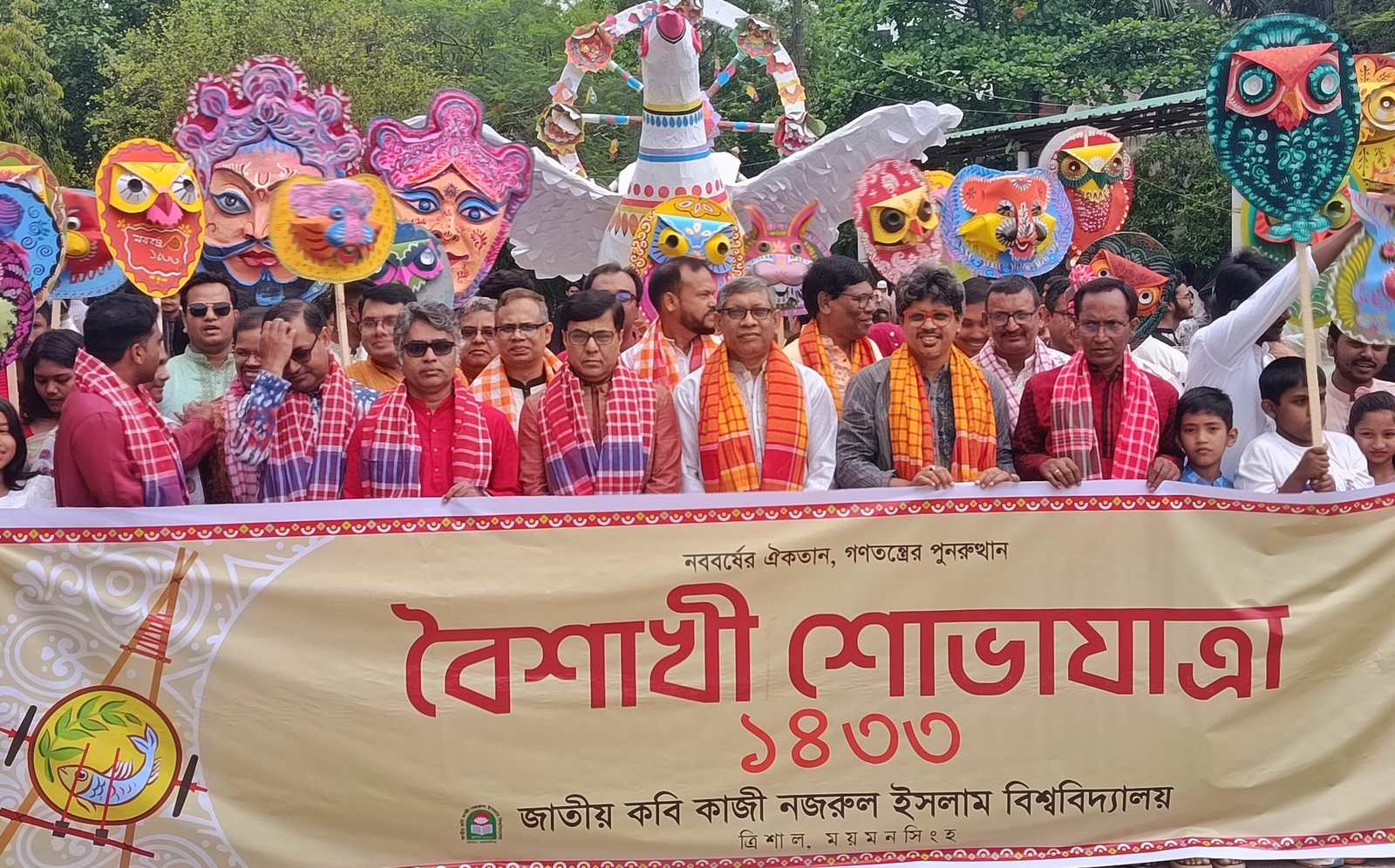 মঙ্গলবার (১৪ এপ্রিল) সকালে ‘বৈশাখী শোভাযাত্রা’ পর্বের মাধ্যমে এদিনটির কর্মসূচির সূচনা করা হয়। বিশ্ববিদ্যালয়ের গাহি সাম্যের গান মঞ্চের সামনে থেকে বের হওয়া এ বর্ণাঢ্য শোভাযাত্রার নেতৃত্ব দেন উপাচার্য অধ্যাপক ড. মো. জাহাঙ্গীর আলম।পরে ক্যাম্পাসের প্রধান প্রধান সড়ক প্রদক্ষিণ করে পুনরায় গাহি সাম্যের গান মঞ্চে এসে শেষ হয়।এর আগে সোমবার চৈত্রসংক্রান্তি উপলক্ষে ফিতা কেটে বৈশাখী মেলার উদ্বোধন করেন উপাচার্য।