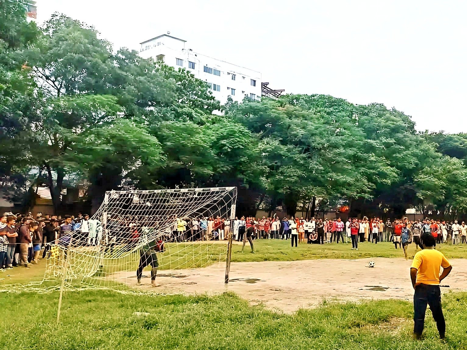 দেড়টায় জুমা, চারটায় ম্যাচ। মাঝের এই আড়াই ঘন্টায় বিয়ের মত আনুষ্ঠানিকতা সেরে আসা অসম্ভব। এই অসম্ভবকে সম্ভব করে আসতে আসতে তাই ম্যাচ কিছুক্ষণ লেট হলো। বিয়ের আসর থেকে তাড়াতাড়ি কবুল বলে বিয়ের জামাকাপড়েই পাত্র মাঠে হাজির। মাঠেই ড্রেস আপ চেঞ্জ করে গোলবারের নীচে দাঁড়িয়ে গেল।