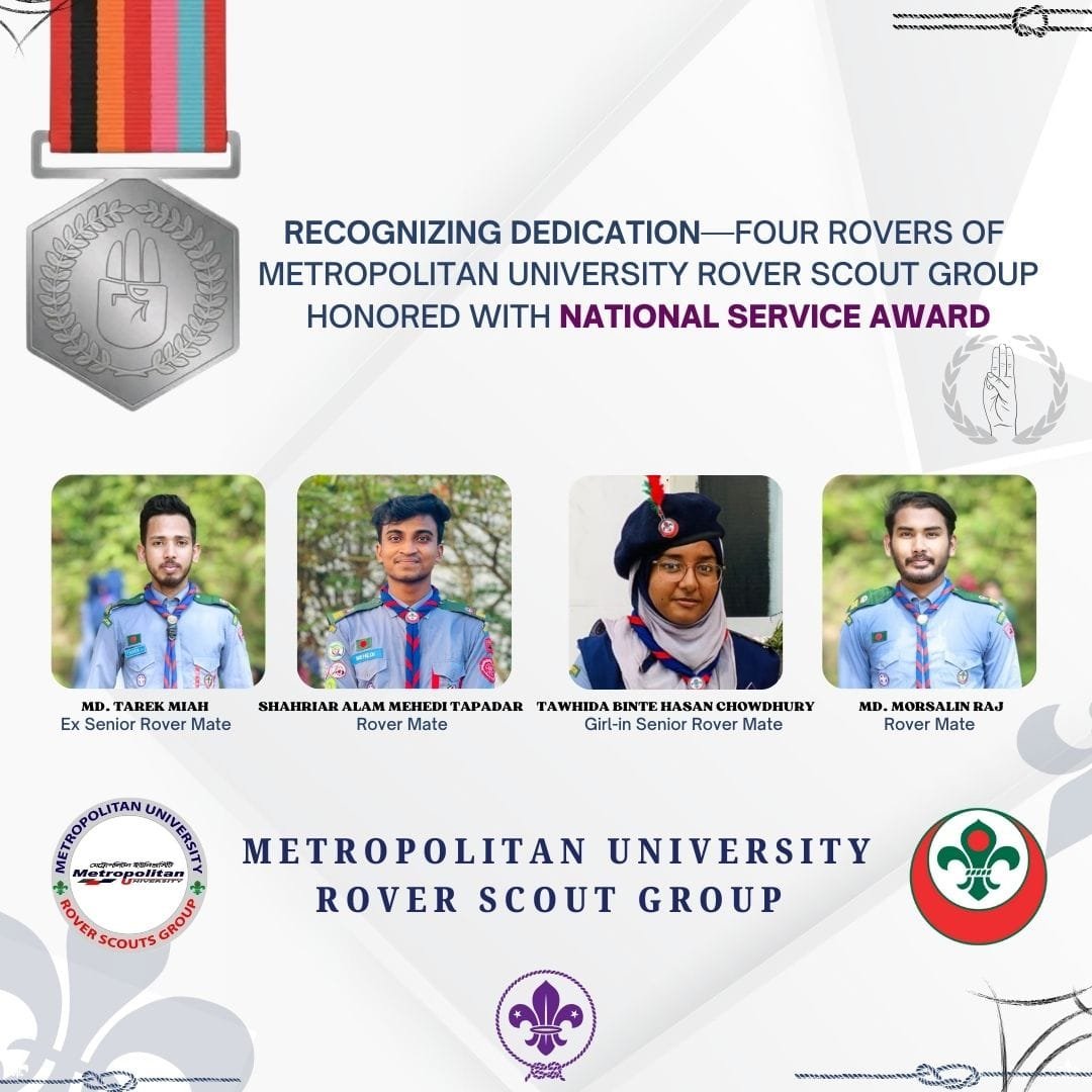 মানবসেবা ও সমাজকল্যাণমূলক কর্মকাণ্ডে গুরুত্বপূর্ণ ও ধারাবাহিক অবদানের স্বীকৃতিস্বরূপ ‘ন্যাশনাল সার্ভিস অ্যাওয়ার্ড’ অর্জন করেছেন মেট্রোপলিটন ইউনিভার্সিটি রোভার স্কাউট গ্রুপের চারজন সদস্য। এই সম্মাননা প্রাপ্তির মাধ্যমে বিশ্ববিদ্যালয়টির রোভার স্কাউটিং কার্যক্রম জাতীয় পর্যায়ে বিশেষভাবে স্বীকৃত ও প্রশংসিত হয়েছে।