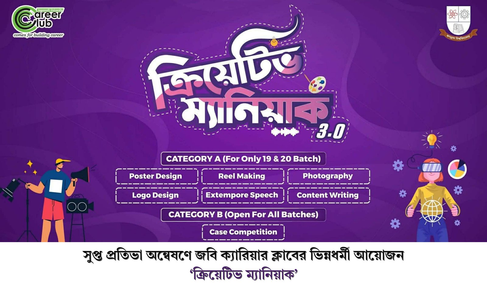 শিক্ষার্থীদের সৃজনশীল দক্ষতা বৃদ্ধি এবং সুপ্ত প্রতিভা বিকাশের লক্ষ্যে জগন্নাথ বিশ্ববিদ্যালয় ক্যারিয়ার ক্লাবের (JnUCC) অনন্য আয়োজন ‘ক্রিয়েটিভ ম্যানিয়াক’। এটি ক্লাবটির অন্যতম একটি সিগন্যাচার ইভেন্ট। একাডেমিক পড়াশোনার পাশাপাশি শিক্ষার্থীদের ভেতরের সৃজনশীল সত্তাকে একটি পেশাদার প্ল্যাটফর্ম দেওয়ার লক্ষ্যেই এই ভিন্নধর্মী উদ্যোগ নেওয়া হয়েছে।