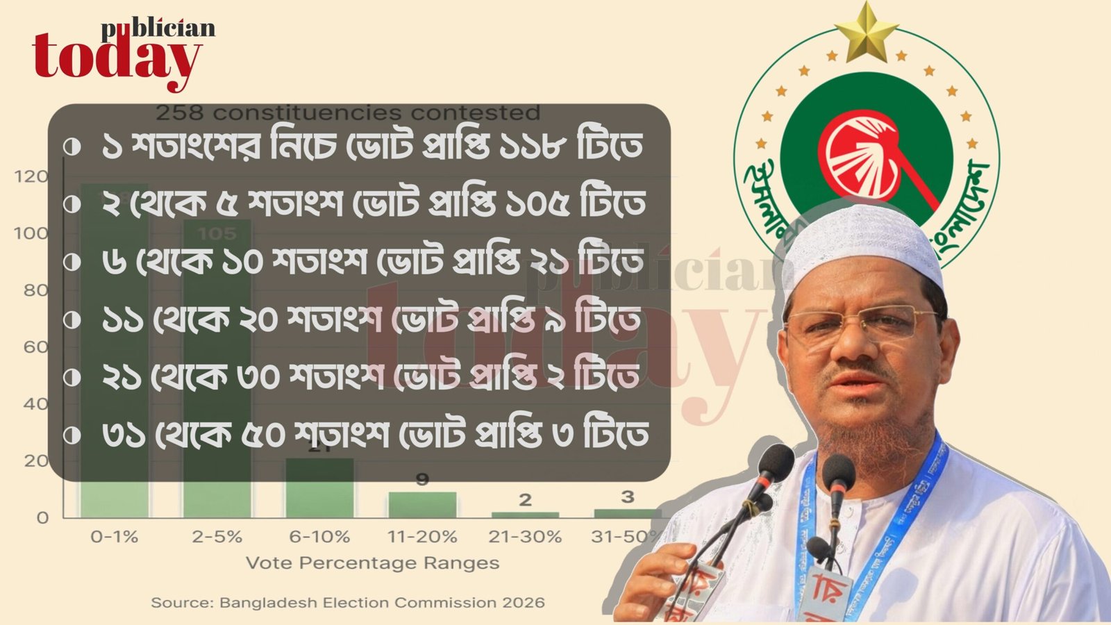 এই তথ্যের উৎস হিসেবে তিনি বাংলাদেশ নির্বাচন কমিশন–এর তথ্যের কথা উল্লেখ করেন। সংশ্লিষ্ট বিশ্লেষণে বলা হয়, ফলাফলগুলো থেকে বোঝা যায় দলটির ভোটভিত্তি কিছু নির্দিষ্ট এলাকায় তুলনামূলক শক্ত হলেও সার্বিকভাবে অধিকাংশ আসনে সমর্থন সীমিত রয়েছে।